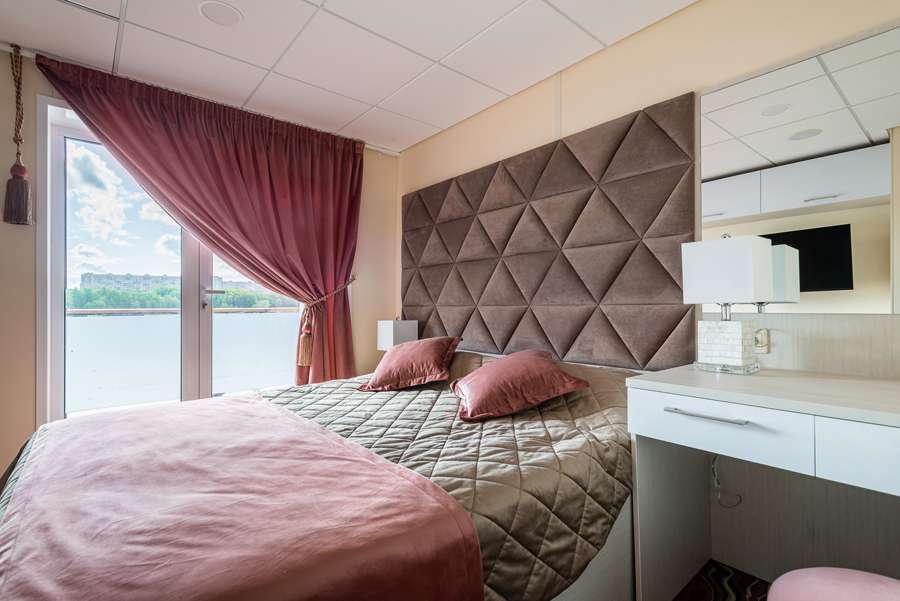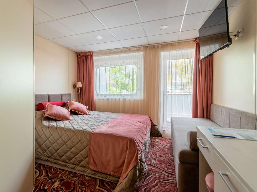 Полулюкс с балконом Б К категории Полулюкс с балконом Б относятся каюты: 403–406, 409, 411, 415, 416–418. Двухместная каюта увеличенной площади со всеми удобствами, расположенная на шлюпочной палубе. Площадь каюты от 19,4 до 21,7 м² (включая балкон от 4,7 до 6,7 м²). Возможно размещение третьего человека на дополнительном спальном месте – односпальный диван. Размещение ребенка до 5 лет без места и питания, при наличии свободного дополнительного места, производится только по согласованию