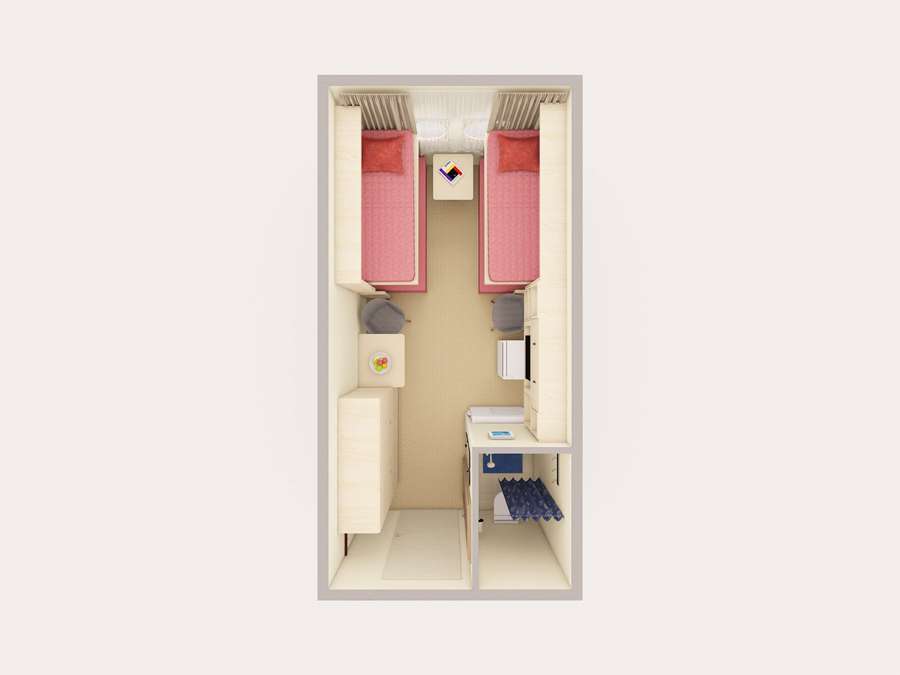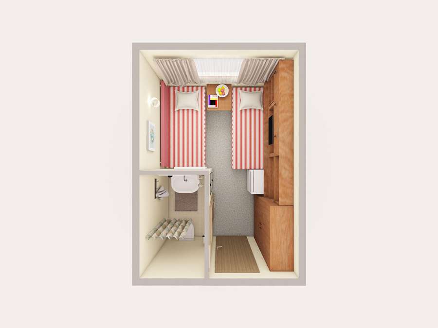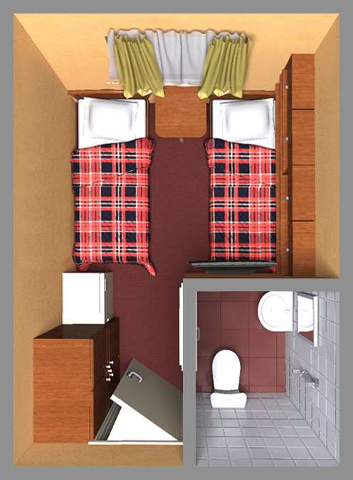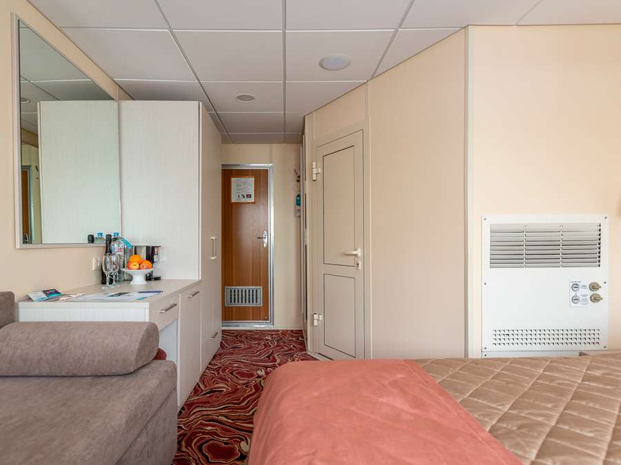 А2(I) К категории А2(I) относится каюта 423. Двухместная каюта со всеми удобствами, расположенная на шлюпочной палубе. Площадь каюты ≈ 9,9 м².