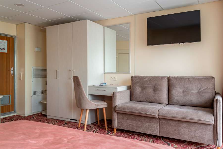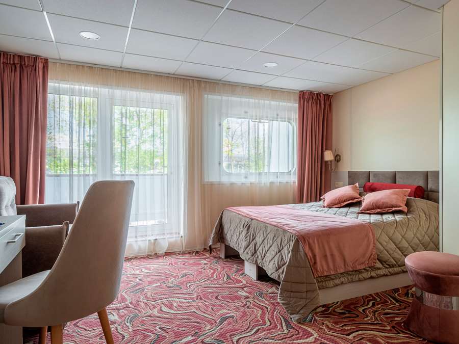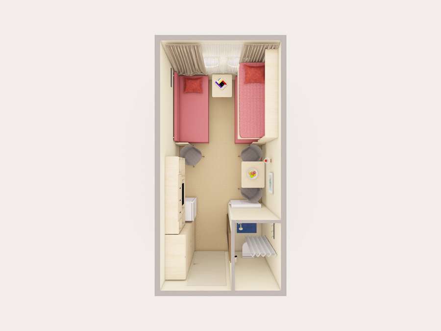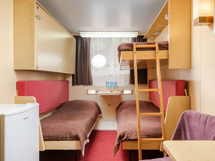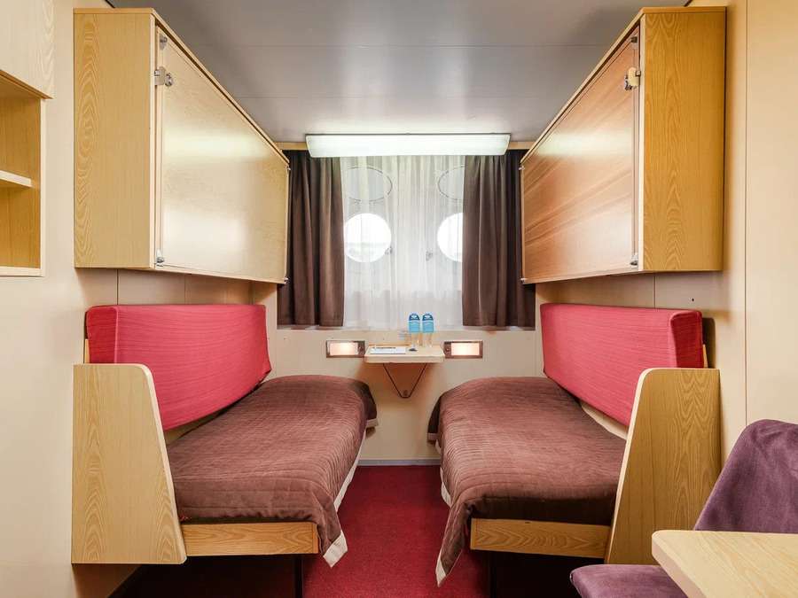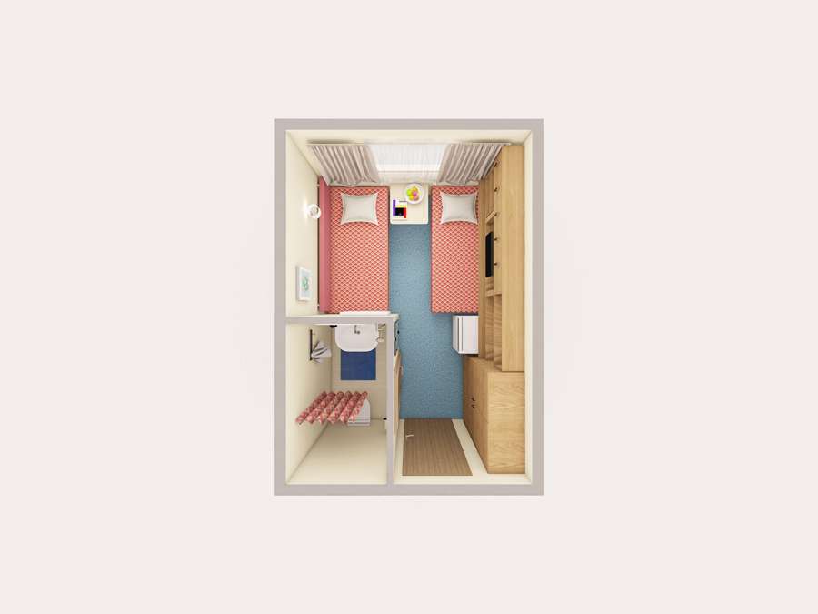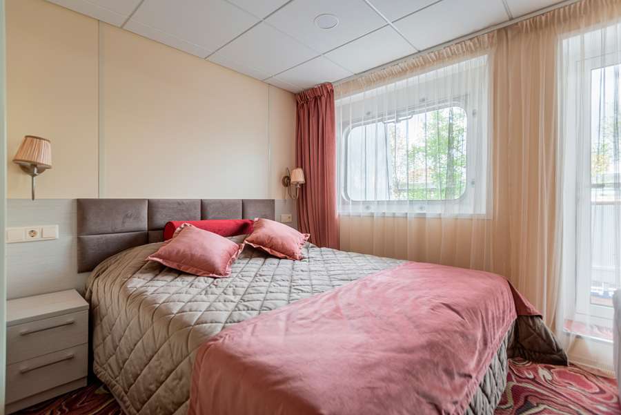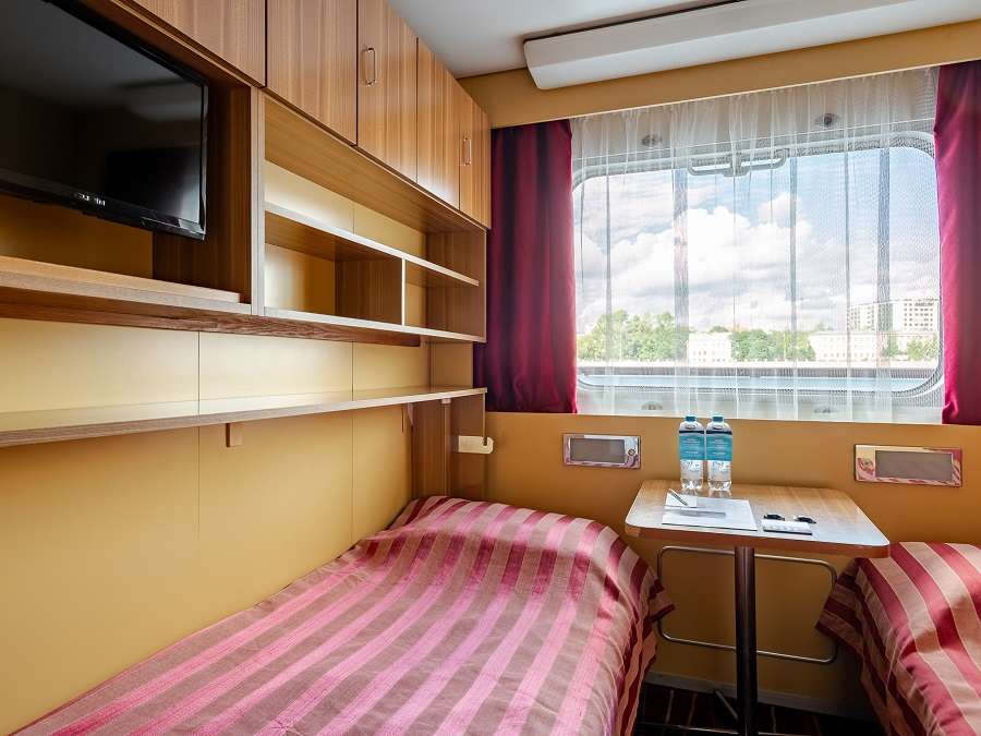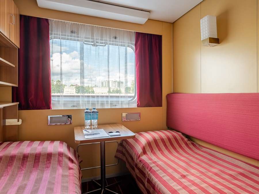А2(II) К категории А2(II) относятся каюты: 313–336. Двухместная каюта со всеми удобствами, расположенная на средней палубе. Площадь каюты ≈ 10 м². В каютах 313–324 возможно размещение третьего человека на дополнительном спальном месте – верхняя полка с мягким ограждением. В каютах 313, 314 частично ограниченный обзор из-за находящегося рядом трапа. Размещение ребенка до 5 лет без места и питания, при наличии свободного дополнительного места, производится только по согласованию с судоходной компанией. В навигации 2026 каюты 325–336 переходят в категорию А2 комфорт. Изображение кают является рендером и носит ознакомительный характер.