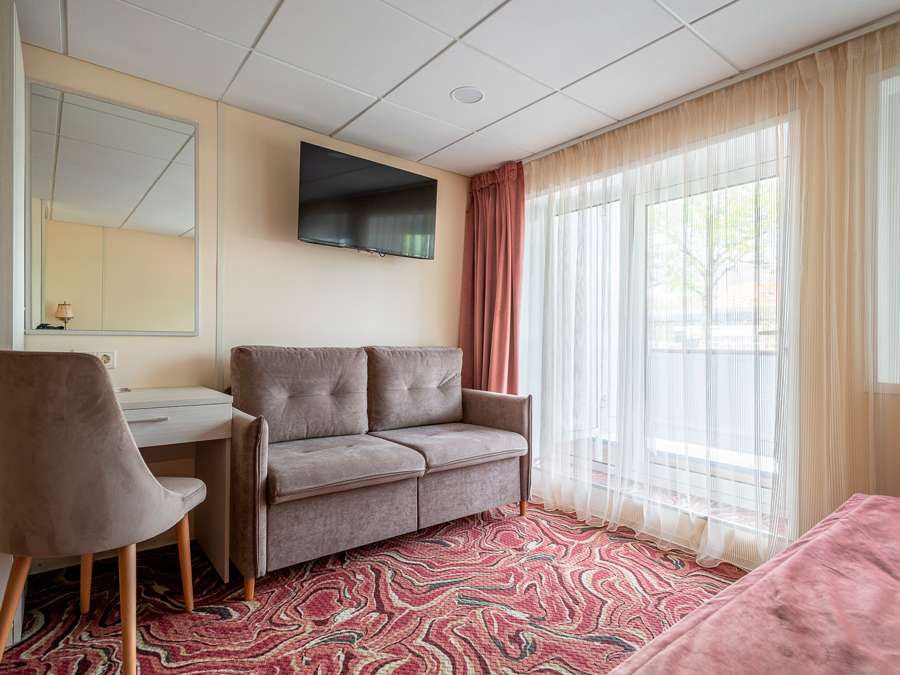 Полулюкс с балконом А К категории Полулюкс с балконом А относятся каюты: 408, 410, 412, 413, 414, 419, 420, 422. Двухместная каюта увеличенной площади со всеми удобствами, расположенная на шлюпочной палубе. Площадь каюты от 26,4 до 28,7 м² (включая балкон от 7 до 9 м²). Возможно размещение третьего и четвертого человека на дополнительных местах – двуспальный диван. Размещение ребенка до 5 лет без места и питания, при наличии свободного дополнительного места, производится только по согласованию.
