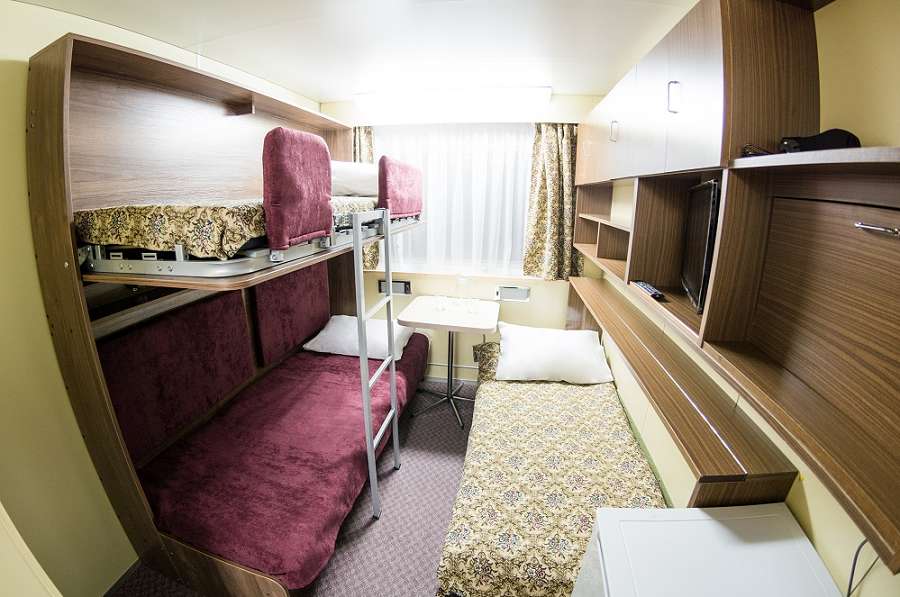 А3н К категории А3н относятся каюты: 101, 105, 106, 109, 110, 113. Трехместная двухъярусная каюта со всеми удобствами, расположенная на нижней палубе. Площадь каюты от 12,9 до 14,5 м². Возможно размещение четвертого человека на дополнительном спальном месте верхнего расположения.