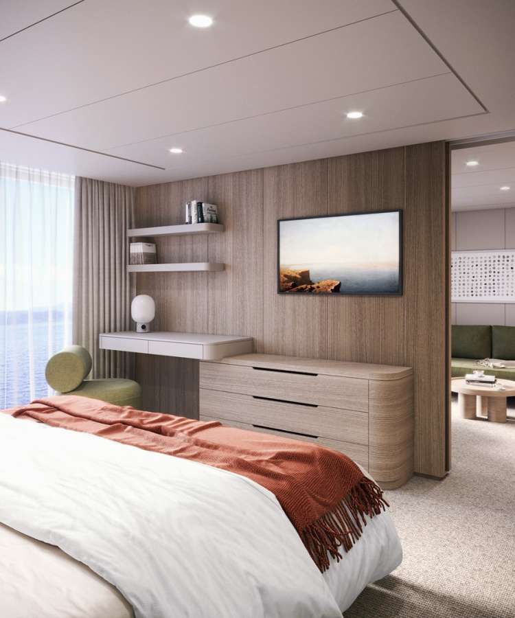 Оформление кают выполнено с использованием премиальных материалов. Эксклюзивный текстиль и удобные кровати помогут расслабиться и насладиться вашим путешествием в полной мере. Во всех каютах: шкаф для одежды, балкон или панорамное окно, кондиционер, душ, санузел, радио, розетка 220V, холодильник, капсульная кофемашина, электрочайник, телевизор (спутниковое ТВ), телефон, сейф, фен.