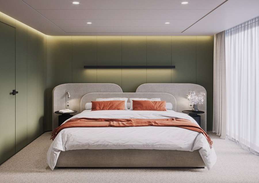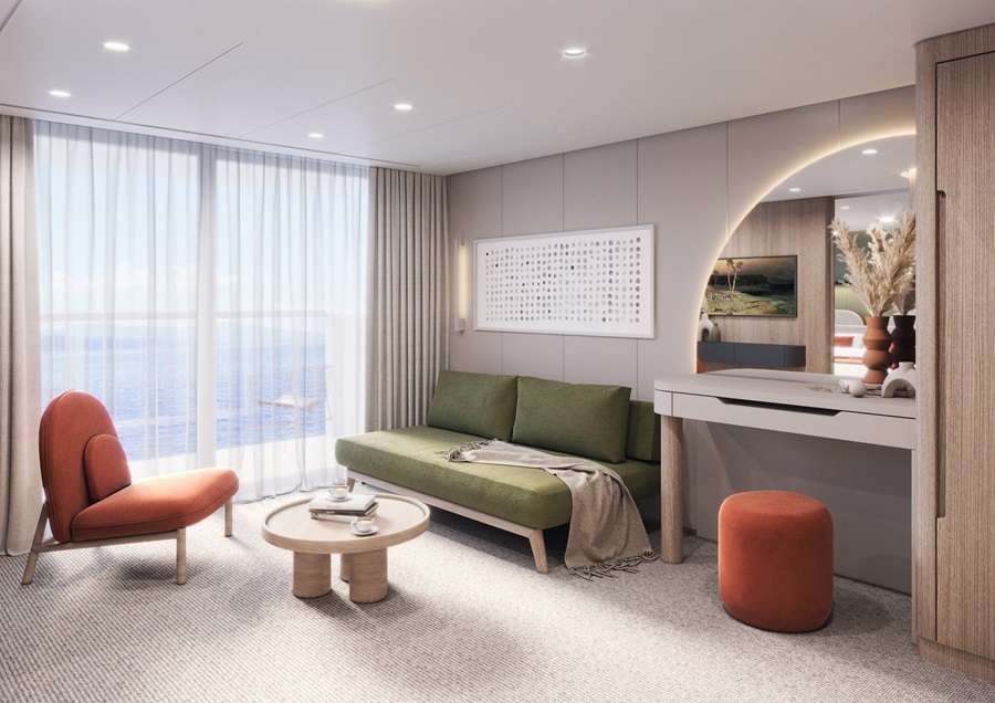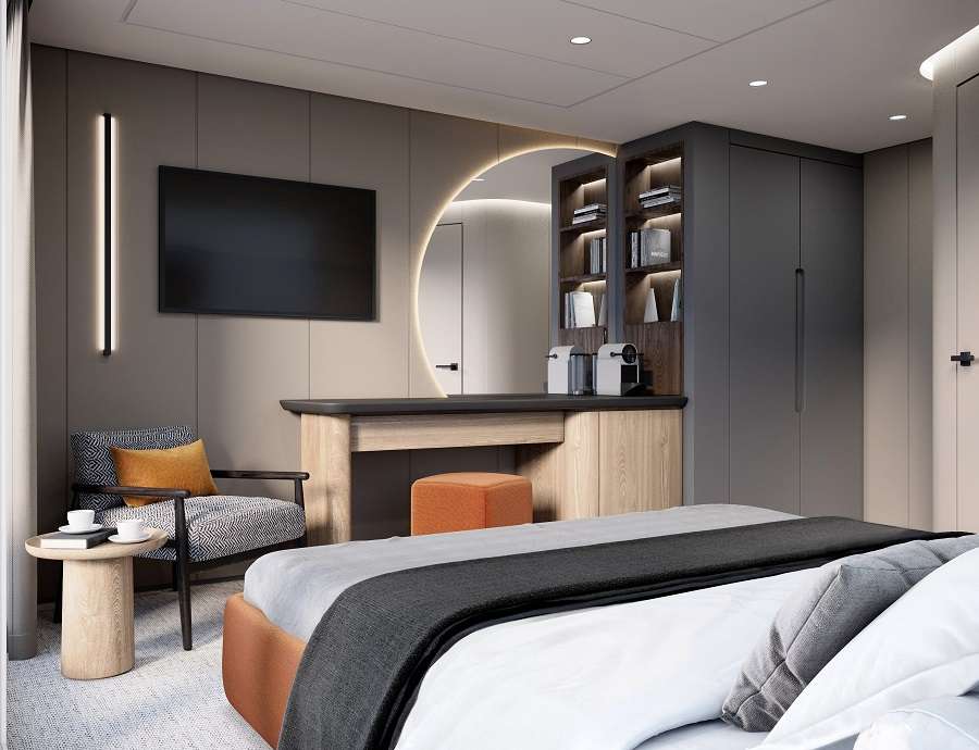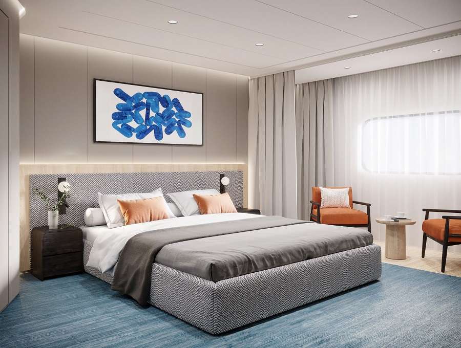 Для удобства гостей на борту общественные пространства и спальные зоны с каютами разделены. Стильный и лаконичный дизайн, цветовая гамма, сочетающаяся с небом и морем, элегантные атриумы с мягкой зоной, бесшумный лифт, плавные лестницы с подсветкой, панорамные окна – все это создает ощущение простора и комфорта.