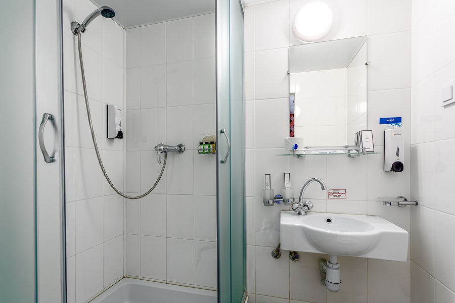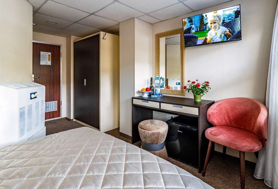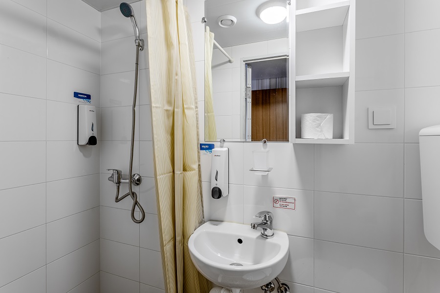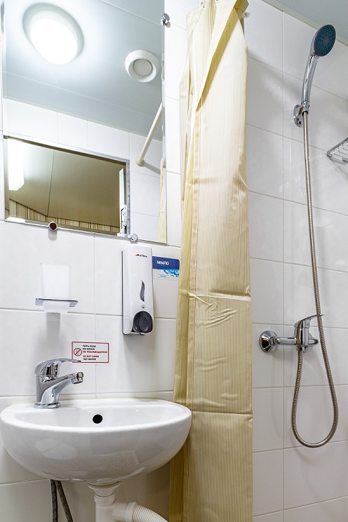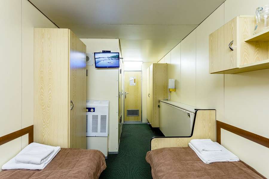 В каждой каюте теплохода есть кондиционер, холодильник или мини-бар, ТВ и Wi-Fi, в ванных комнатах – выделенная зона для душевой, в «Полулюксах» – душевая кабина.
