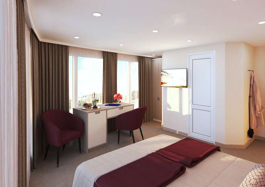 Полулюкс А-С с балконом К категории Полулюкс А-С с балконом относятся каюты: 406–410, 412–416. Каюты данной категории носят имена: № 406 – «Людмила Гурченко» № 412 – «Юрий Никулин» № 407 – «Евгений Евстигнеев» № 413 – «Любовь Орлова» № 408 – «Леонид Куравлев» № 414 – «Иннокентий Смоктуновский» № 409 – «Евгений Леонов» № 415 – «Сергей Юрский» № 410 – «Нонна Мордюкова» № 416 – «Олег Янковский» Двухместная каюта увеличенной площади со всеми удобствами, расположенная на шлюпочной палубе. Площадь каюты от 23,4 до 28,6 м² (включая балкон от 7,3 до 8,8 м²). В каютах 407–409, 412 возможно размещение третьего и четвертого человека на дополнительных спальных местах – двуспальный диван. В каютах 406, 410, 413–416 возможно размещение третьего человека на дополнительном спальном – тахта. Размещение ребенка до 5 лет без места и питания, при наличии свободного дополнительного места, производится только по согласованию.