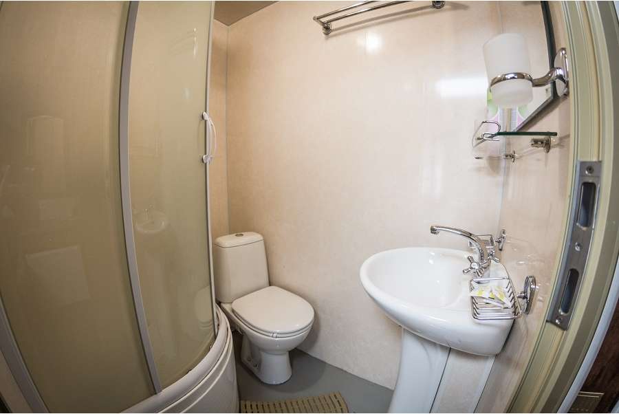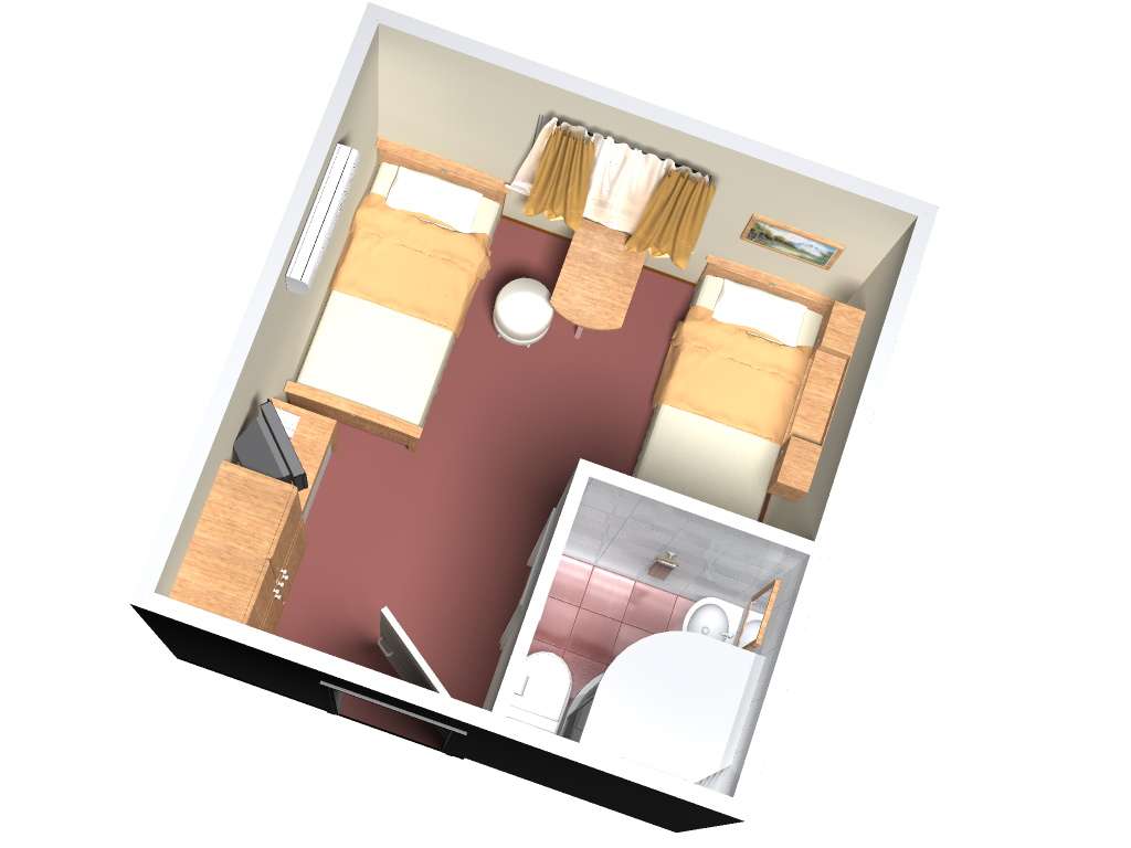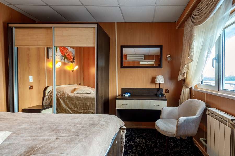 А2 К категории А2 относятся каюты: 309, 311. Двухместная каюта увеличенной площади со всеми удобствами, расположенная на средней палубе. Площадь каюты ~ 12 м². В каюте 311 можно установить дополнительное спальное место – раскладная кровать. Размещение ребенка до 5 лет без места и питания, при наличии свободного дополнительного места, производится только по согласованию с судоходной компанией. В каюте возможен шум от работы вспомогательных агрегатов и температура воздуха на 2 градуса выше, чем средняя по каютам.