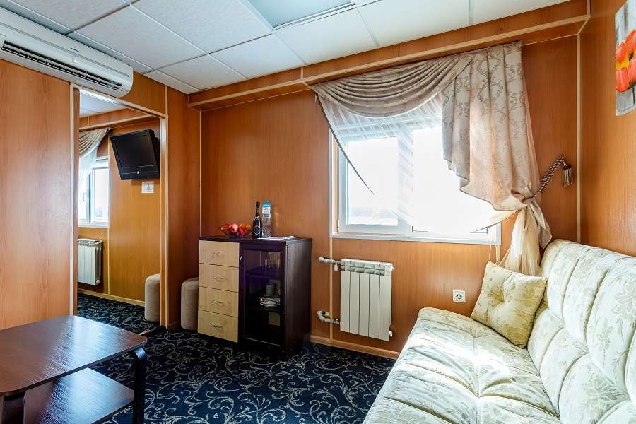 Люкс Люкс – двухместная двухкомнатная каюта увеличенной площади со всеми удобствами, расположенная на средней палубе. Площадь каюты ≈ 21 м². Возможно размещение третьего и четвертого человека на дополнительном месте – двуспальный диван. Размещение ребенка до 5 лет без места и питания, при наличии свободного дополнительного места, производится только по согласованию.