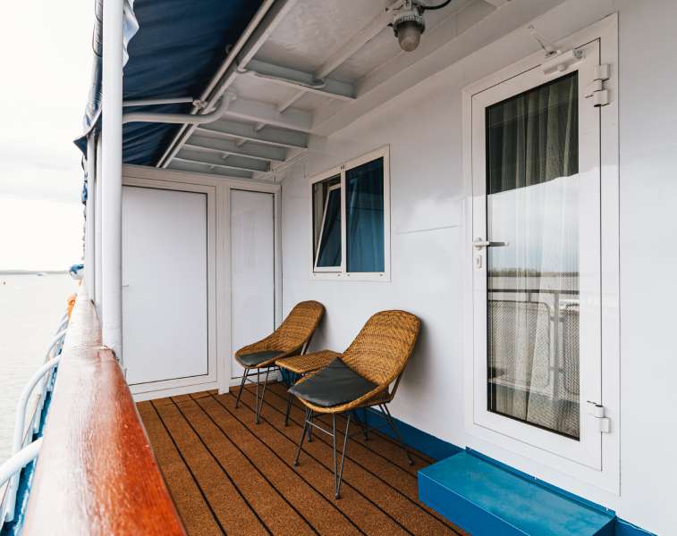 Полулюкс с балконом К категории Полулюкс с балконом относятся каюты: 401–402, 404–414. Площадь каюты от 19 до 20,8 м² (включая балкон ≈ 6 м²). В каютах 411, 412 – возможно размещение третьего и четвертого человека на дополнительных местах – двуспальный диван. В каютах 401, 413, 414 – возможно размещение третьего человека на дополнительном месте – кресло-кровать. Размещение ребенка до 5 лет без места и питания, при наличии свободного дополнительного места, производится только по согласованию.