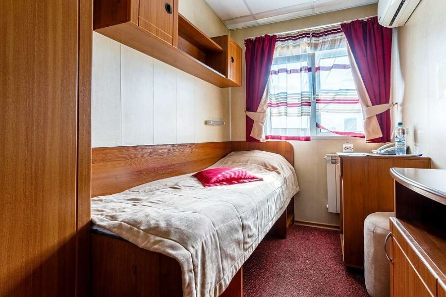 А1(I) К категории А1(I) относятся каюты: 201, 202, 205, 206, 313. Одноместная каюта со всеми удобствами, расположенная на средней и главной палубах. Площадь каюты от 7,8 до 9 м².