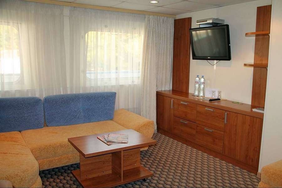 К категории Люкс двухкомнатный+ относятся каюты: 415, 416. Двухкомнатная двухместная каюта со всеми удобствами, расположенная на шлюпочной палубе. Площадь каюты ≈ 26 м². Размер кровати – 160х200 см. Доступ к Wi-Fi предоставляется без ограни