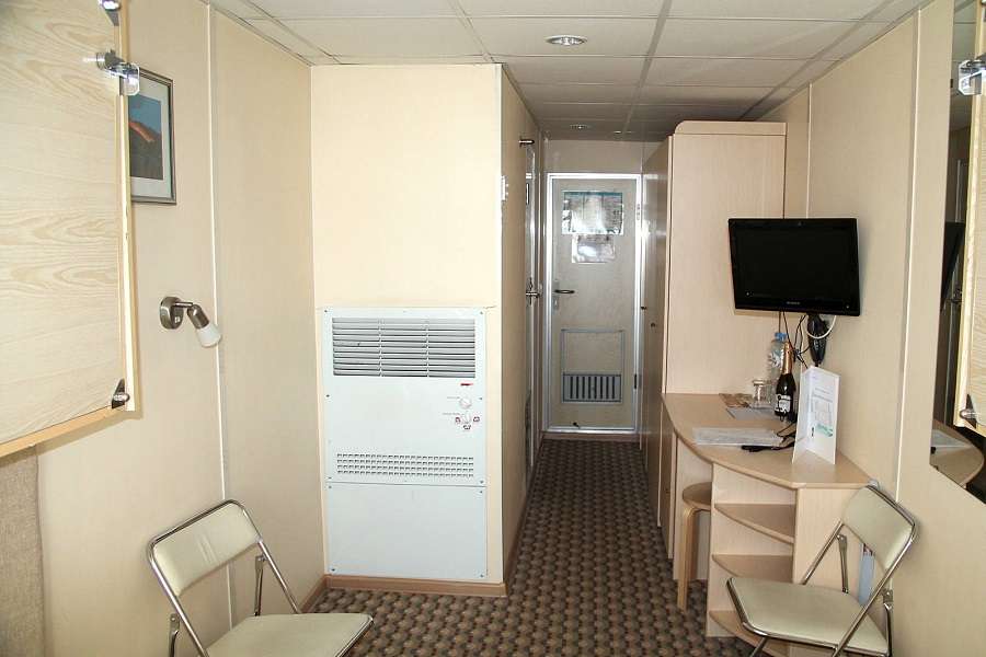 Комфорт 1-местный К категории Комфорт 1-местный относятся каюты: 419–426. Одноместная каюта со всеми удобствами, расположенная на шлюпочной палубе. Площадь каюты ≈ 6 м². Доступ к Wi-Fi предоставляется с ограничением трафика. ондиционер, тел