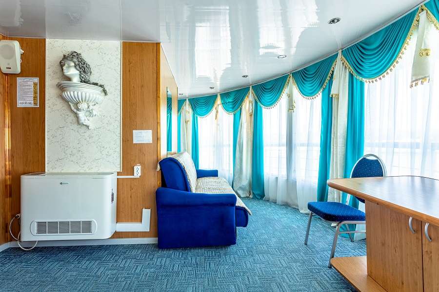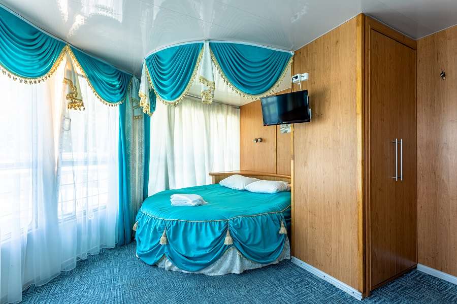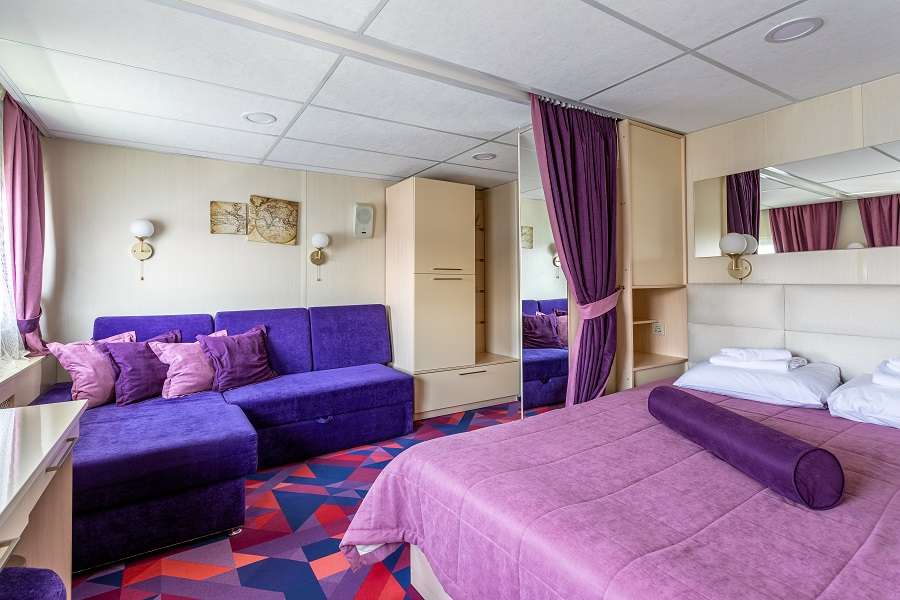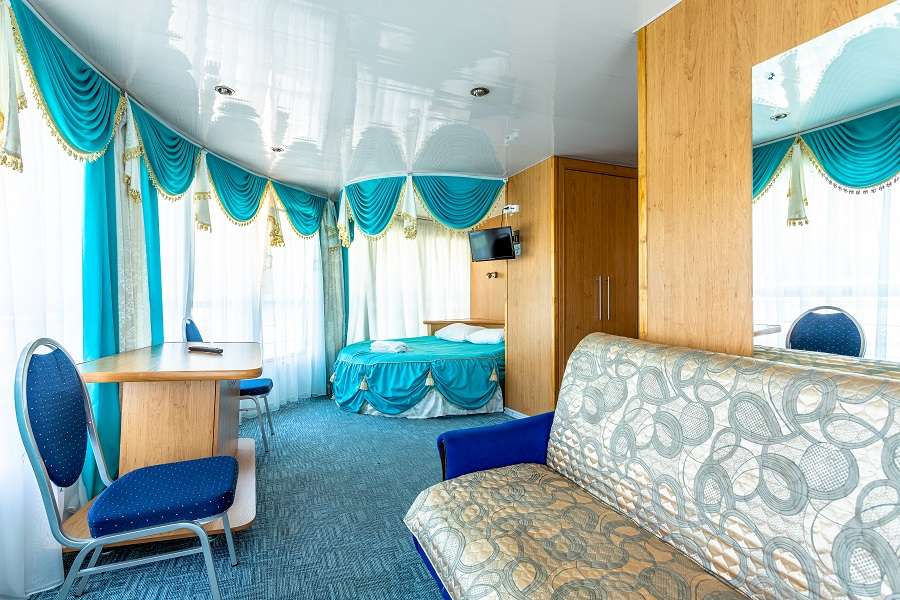 Панорамный люкс относится каюта «Екатерина Великая». Каюта увеличенной площади со всеми удобствами, расположенная на шлюпочной палубе. Возможно размещение третьего и четвертого человека на дополнительном места – двуспальный диван. В каюте: двуспальная кровать, двуспальный диван, ванная комната (раковина, душевая кабина, туалет), шкаф для одежды, стол, стулья, холодильник, кондиционер, мини-кухня, фен, телевизор, обзорные панорамные окна.