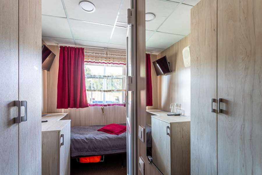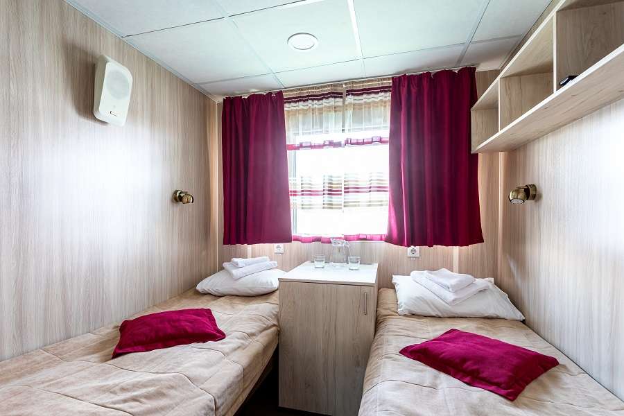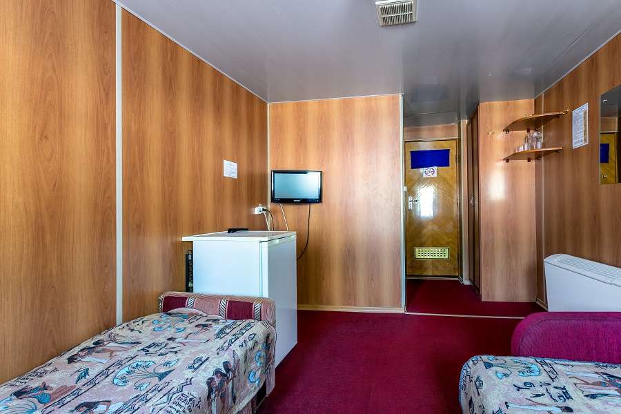 Для проживания туристов представлены каюты разных категорий. От кают эконом класса до просторных панорамных люксов. В каждой каюте есть телевизор и холодильник. В каютах на главной, средней и шлюпочной палубах — обзорные окна. В каютах, расположенных в трюме — иллюминаторы. К навигации 2022 некоторые каюты, расположенные на корме средней палубы, модернизированы и оборудованы ванной комнатой с корабельным душем, общей системой вентиляции, обновлён текстиль и материал стен. Также в каютах сохранятся в наличии шкаф, стол, холодильник, фен, телевизор.