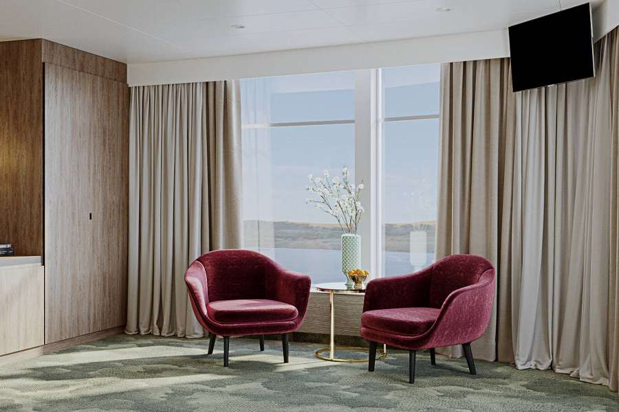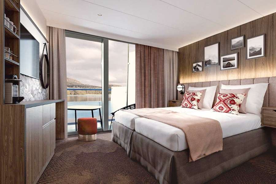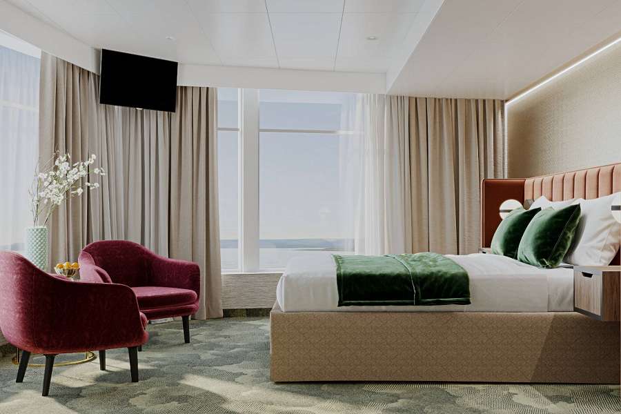 В каюте: двуспальная кровать (можно раздвинуть), кондиционер/обогреватель, телевизор, сейф, внутренний телефон, фен, холодильник, стеклянные стаканы для питья, щетка для одежды, тапочки, панорамный оконно-дверной блок, с выходом на индивидуальный балкон.