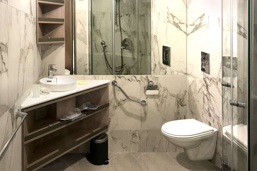 В ванной комнате: душ, зеркало, 2 стакана, туалетные принадлежности (мыло, шампунь, гель для душа, туалетная бумага), комплект полотенец (полотенце банное большое, полотенце для рук среднее, полотенце для ног).