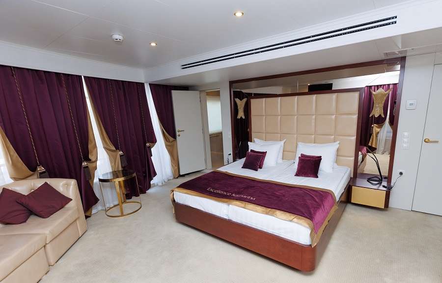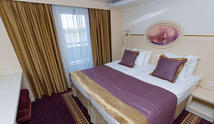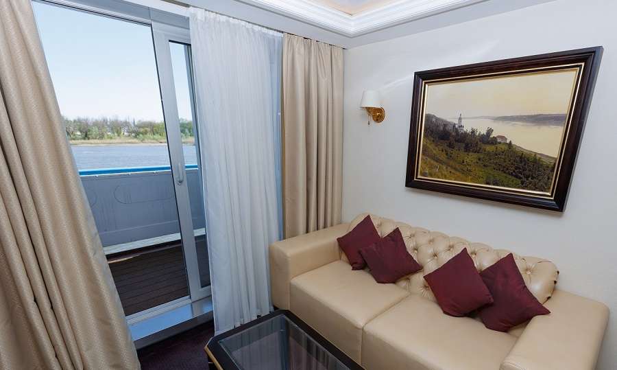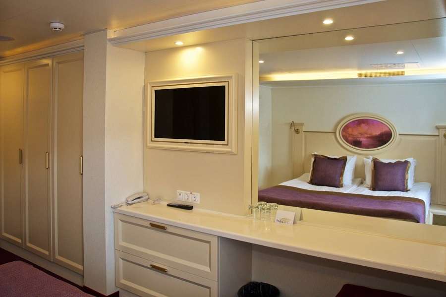 В каюте: двуспальная кровать (можно раздвинуть), кондиционер/обогреватель, телевизор, сейф, внутренний телефон, фен, холодильник, стеклянные стаканы для питья, щетка для одежды, тапочки, панорамный оконно-дверной блок, с выходом на индивидуальный балкон.