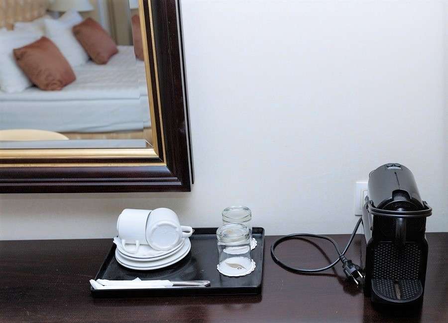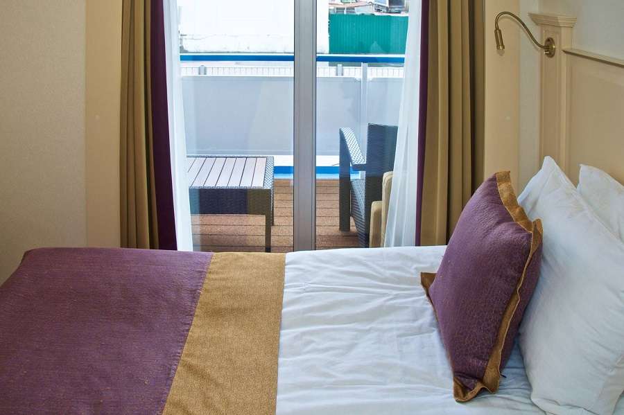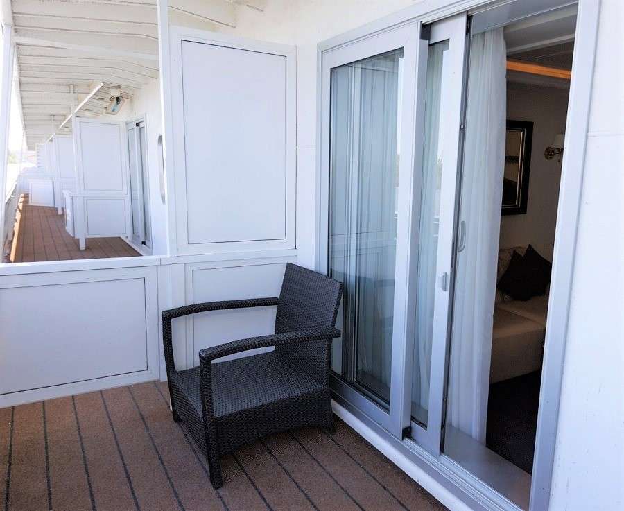 В каюте: двуспальная кровать (не раздвигается), кондиционер/обогреватель, телевизор, сейф, внутренний телефон, фен, холодильник, капсульная кофемашина (по одной капсуле кофе ежедневно на основное место), набор посуды (тарелки, вилки, ножи, стаканы для воды, винные бокалы, чайная пара), щетка для одежды, тапочки, салфетки в коробке, фирменные ручка и блокнот, оконно-дверной блок с выходом на индивидуальный балкон.