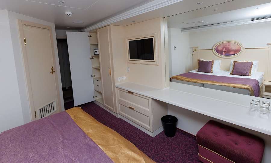 В каюте: двуспальная кровать (можно раздвинуть), кондиционер/обогреватель, телевизор, сейф, внутренний телефон, фен, холодильник, стеклянные стаканы для питья, щетка для одежды, тапочки, обзорное окно.