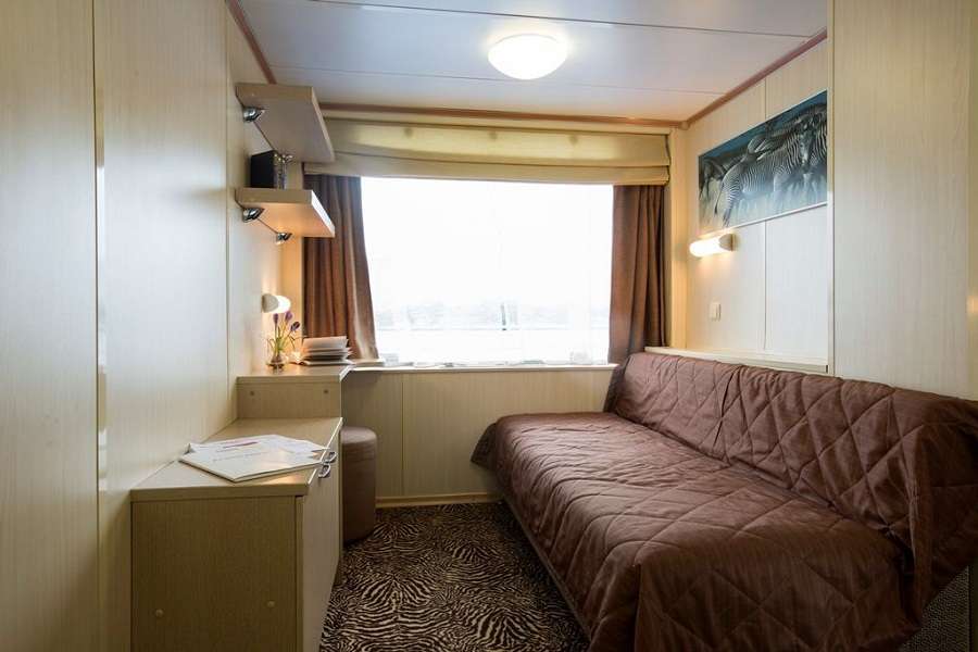 2-местная одноярусная каюта на средней палубе. В каюте: два спальных места, не сдвигаются, шкаф для одежды, радио, центральный кондиционер, холодильник, телевизор, душ, санузел, фен, сейф, обзорное окно, электророзетка на 220V.