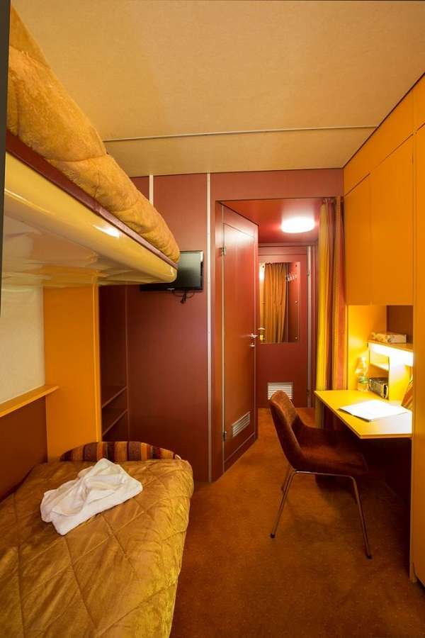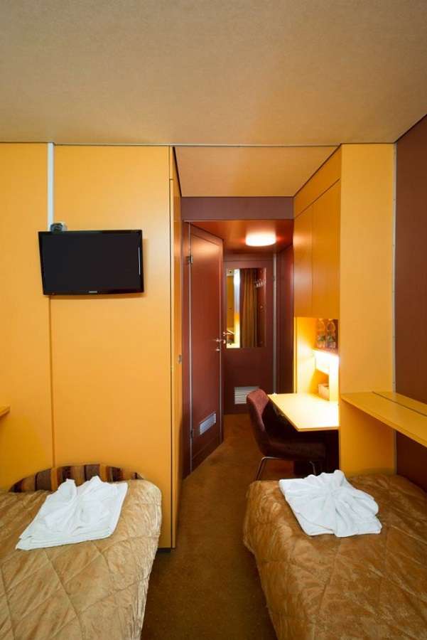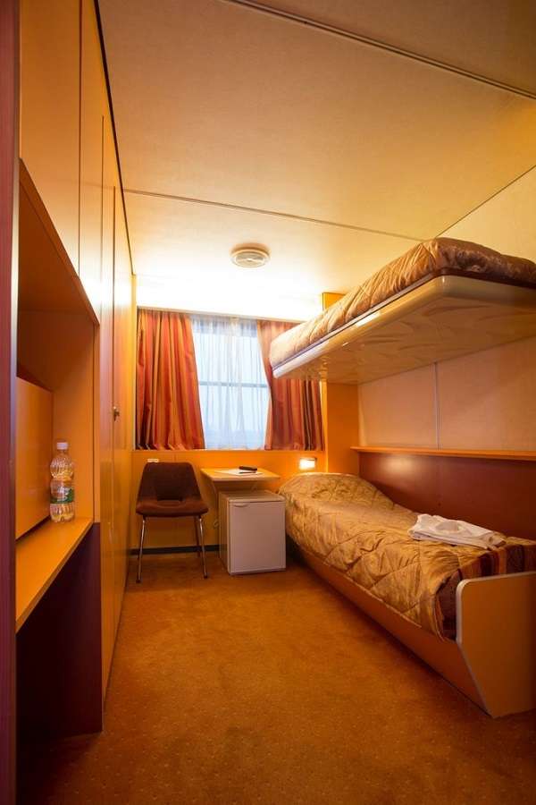2-местная двухъярусная каюта на средней палубе. В каюте: два спальных места (одно над другим), шкаф для одежды, радио, центральный кондиционер, холодильник, телевизор, душ, санузел, фен, сейф, обзорное окно, электророзетка на 220V.
