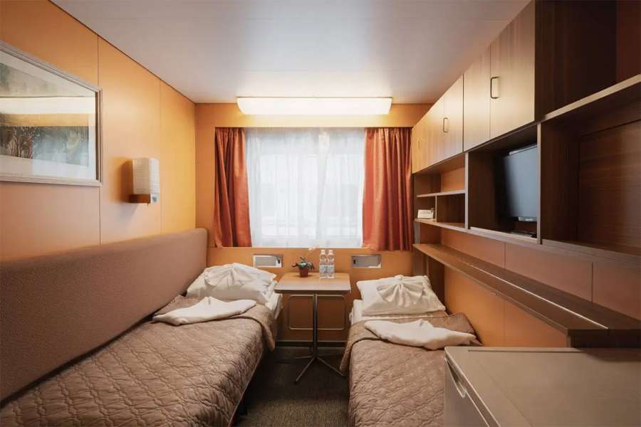 Двухместная одноярусная каюта на шлюпочной палубе. В каюте: два спальных места, шкаф для одежды, холодильник, телевизор, фен, радио, душ, санузел, кондиционер, обзорное окно, электророзетка на 220V.