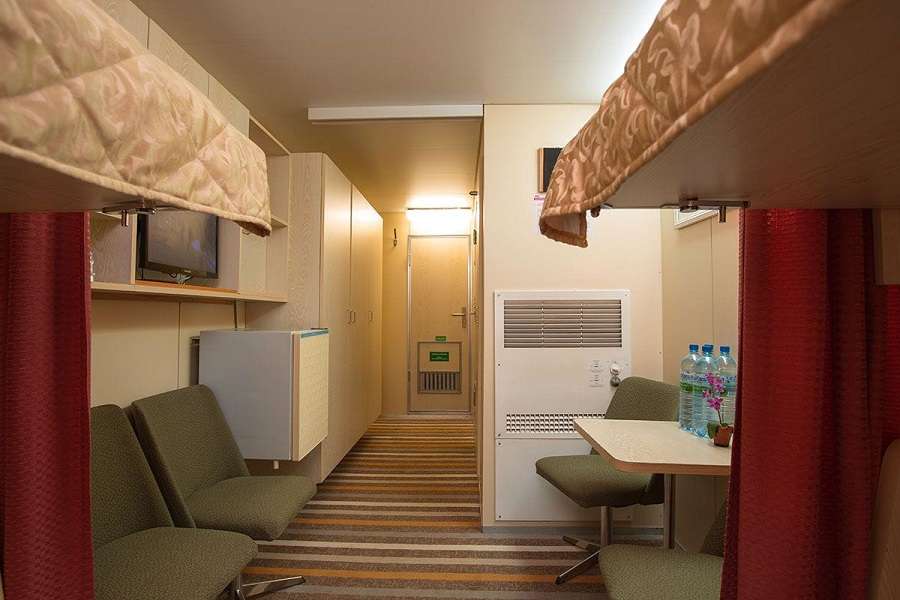 Трехместная двухъярусная каюта (3-местное размещение в 4-местной двухъярусной каюте) на нижней палубе. Четырехместная двухъярусная каюта. В каюте: четыре спальных места (два внизу, два вторым ярусом), шкаф для одежды, холодильник, телевизор, фен, радио, душ, санузел, кондиционер, два иллюминатора, электророзетка на 220V. Площадь каюты - 12,81 кв.м.