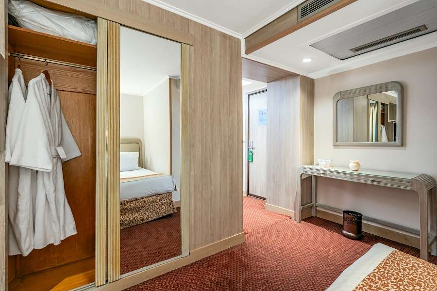 Twin (type II) К категории Twin (type II) относятся каюты: 203–209. Двухместная каюта со всеми удобствами, расположенная на второй палубе. Площадь каюты ≈ 18 м². Бутилированная вода доставляется в каюту ежедневно.